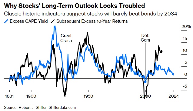 最被广泛采用的长期价值衡量指标是CAPE(周期性调整市盈率),该指标由传奇价值投资者本杰明·格雷厄姆在1930年代首次提出,25年前由诺贝尔奖获得者罗伯特·席勒在《非理性繁荣》一书中普及。该指标的关键在于,估值会根据经济周期进行调整,当经济不景气但可能改善时,倍数会更高,反之亦然。