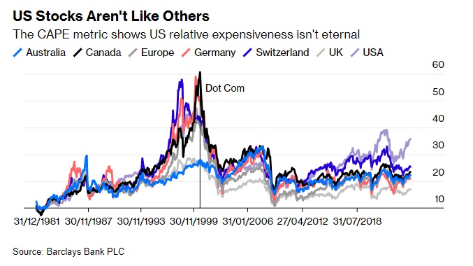 目前,美国市场看起来比其他发达市场要贵得多。但情况并非总是如此:在互联网泡沫的顶峰时期,几个国家的股市比美国更贵,尽管浪潮的中心(就像人工智能一样)显然是美国。