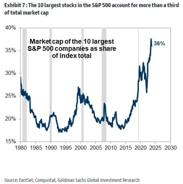 毫无疑问,美国股市(乃至全球股市)异常集中。Kostin发现,集中度在历史上处于第99个百分位数,这很重要:当股票市场集中度较高时,整体指数的表现在很大程度上取决于少数股票的前景。在高度集中的市场环境下,指数的波动性可能会更大。