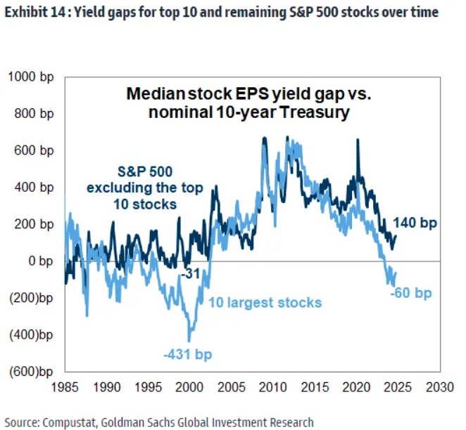 Kostin指出,集中度会影响估值。剔除最大的10只股票,标普500指数的收益率高于10年期美国国债;而最大的10只股票的收益率也在下降,这应该是一个强烈的卖出信号: