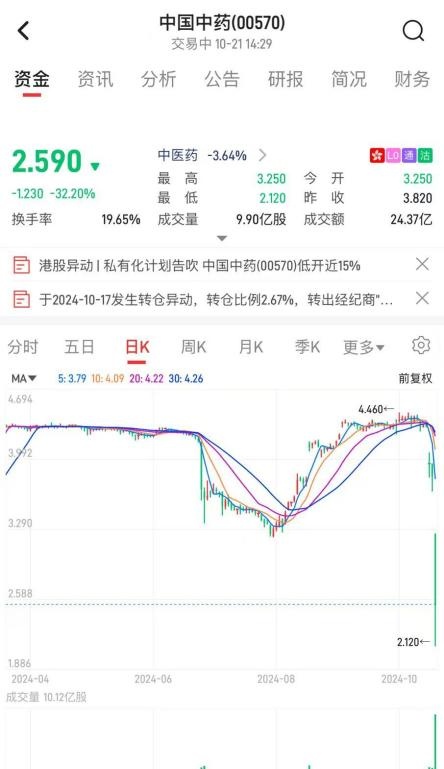 随着这一次私有化尝试再次无疾而终,中国中药的投资者们也终于按捺不住失望的情绪。10月21日,中国中药股价开盘“跳水”,盘中跌幅一度扩大到44.5%,股价下杀至2.12港元,创下11年来新低。
