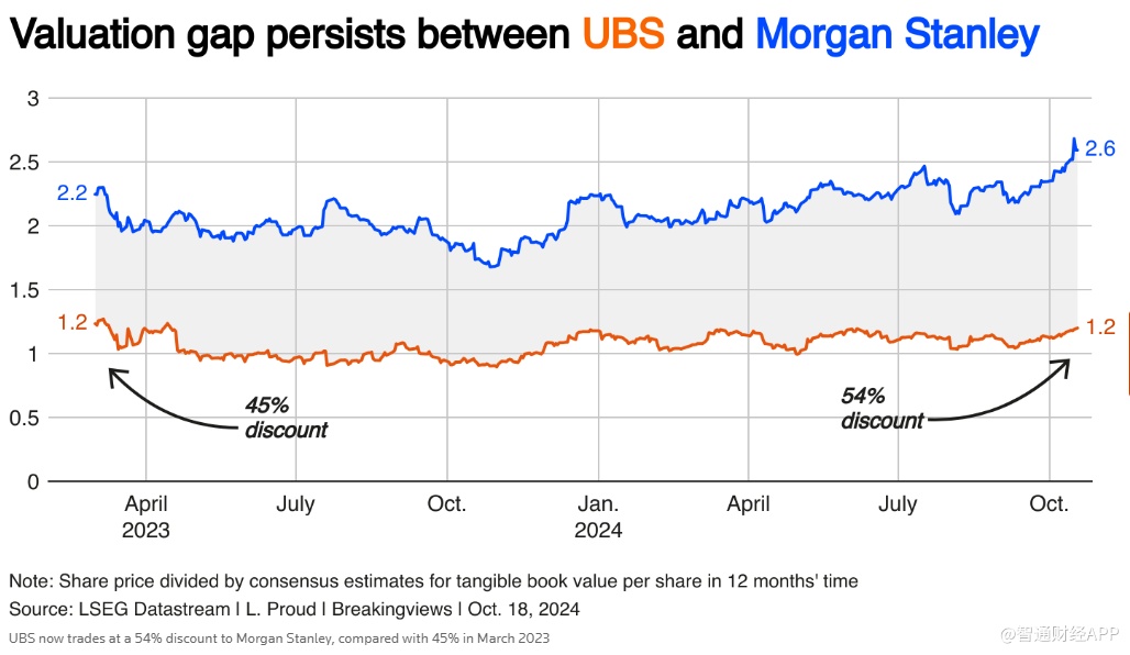 投资者也持谨慎态度。LSEG Datastream的数据显示,在交易前几周,也就是2023年3月初,瑞银股价为未来12个月预期有形账面价值的1.2倍,较摩根士丹利(MS.US)低45%。如今,瑞银的市盈率大致相同,但摩根士丹利的市盈率飙升,两者差距扩大至54%。
