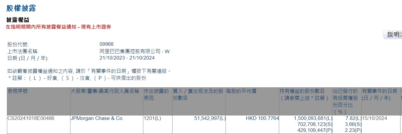 智通财经APP获悉,香港联交所最新资料显示,10月15日,小摩减持阿里巴巴-W(09988)5154.2997万股,每股作价100.7764港元,总金额约为51.94亿港元。减持后最新持股数目约为15亿股,最新持股比例为7.82%。