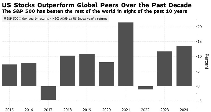 全球金融危机爆发后,美国股市出现反弹,先是受到接近于零的利率的推动,后来又受到对经济增长弹性的押注的推动。根据汇编的数据,在过去10年的8年中,标普500指数的表现有望超过全球其他地区。