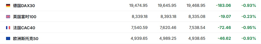 2. 截至发稿,德国DAX指数跌0.93%,英国富时100指数跌0.23%,法国CAC40指数跌0.95%,欧洲斯托克50指数跌0.93%。