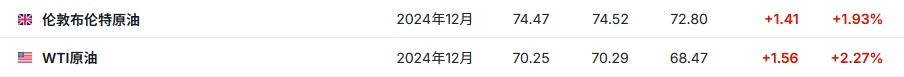 3. 截至发稿,WTI原油涨2.27%,报70.25美元/桶。布伦特原油涨1.93%,报74.47美元/桶。