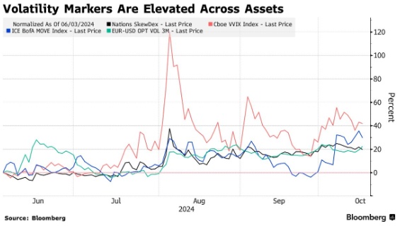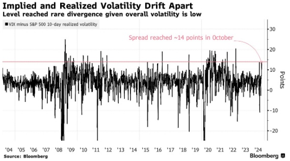 智通财经APP获悉,如果最担心的事情并未发生,那些高度关注未来几周或出现风险的投资者可能会措手不及。由于投资者为获得保护而支付更高的价格,股票、债券和货币期权的波动性上升。风险显而易见,如竞争激烈的美国大选、美国和欧洲的利率决议、中东冲突扩大的威胁,以及财报季的来临。在股市中,隐含波动率超过了实际波动,防范抛售的看跌期权比看涨看涨期权更受青睐。