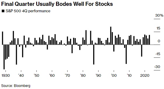 历史上来看,从10月15日到12月底,标准普尔500指数的回报率中位数一直是5.2%。高盛的数据显示,在选举年,这一数字仅略高于7%,这意味着年底的水平为6,270点。彭博汇编的数据显示,在该数据近一个世纪的历史中,只有25年的股市在第四季度出现了负回报。