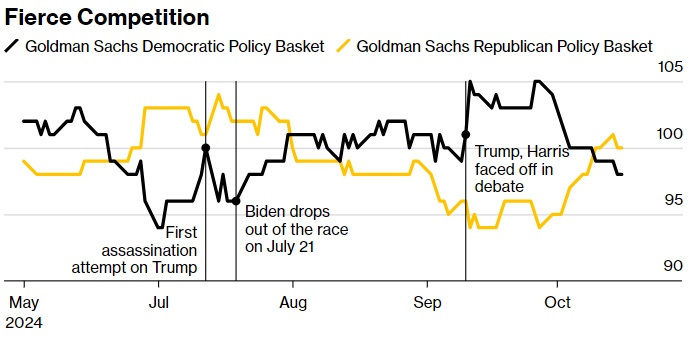 一场实际上就像抛硬币概率一样的选举,让交易员很难对即将发生的事情下注,这也许就是为什么PolyMarket和PredictIt等博彩网站热度较高的原因,在该网站上特朗普成为较为受欢迎的押注。同样,高盛追踪两党可能获胜的交易策略的指数显示,从9月底开始,共和党之后的一篮子股票在上涨,民主党之后的一篮子股票在下跌。