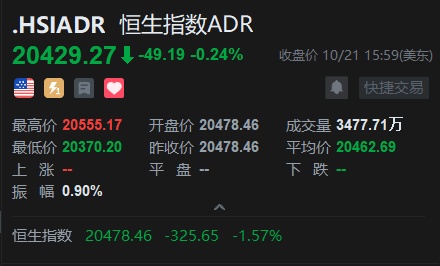 智通财经APP获悉,周一美股三大指数涨跌不一,恒生指数ADR下跌,按比例计算,收报20429..27点,较香港收市下跌49.19点或0.24%。