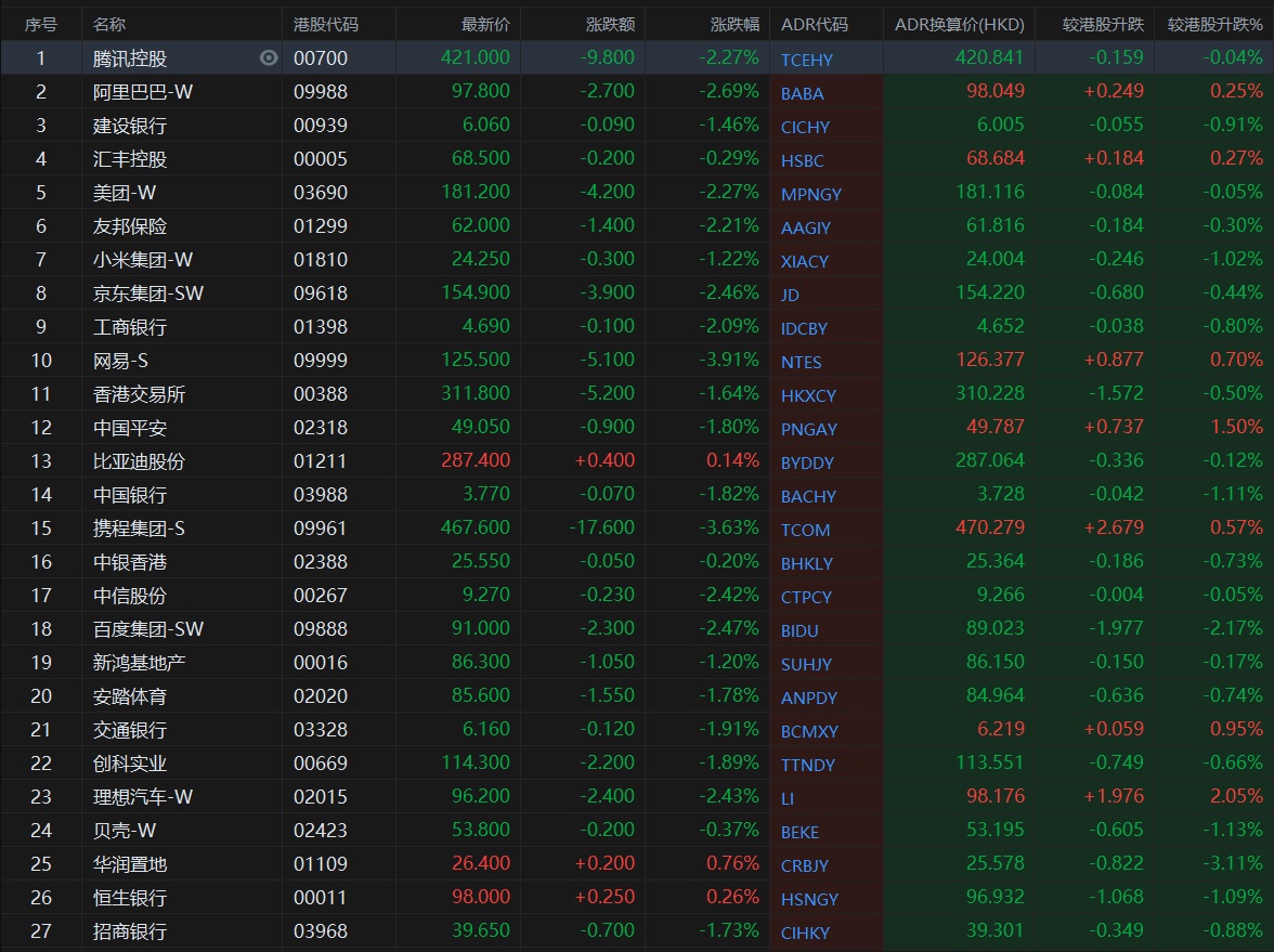 大型蓝筹股多数下跌,汇丰控股收报68.684港元,较香港收市涨0.27%;腾讯控股收报420.841港元,较香港收市下跌0.04%。