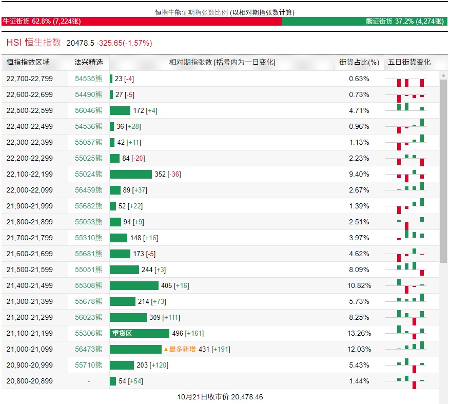 中信证券牛熊证街货分布图中的数据显示,熊证街货重货区在21100-21199区间,该区间最新熊证数量为496张,较上一交易日增加161张;最多新增在21000-21099区间,该区间最新熊证数量为431张,较上一交易日增加191张。