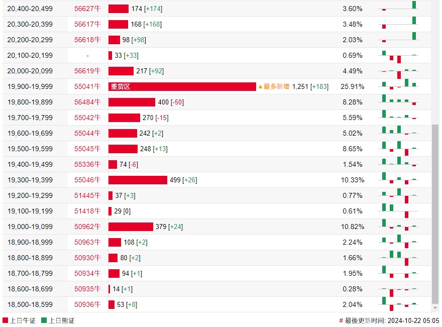 牛证街货重货区在19900-19999区间,该区间最新熊证数量为1251张,较上一交易日增加183张;最多新增在同一区间。