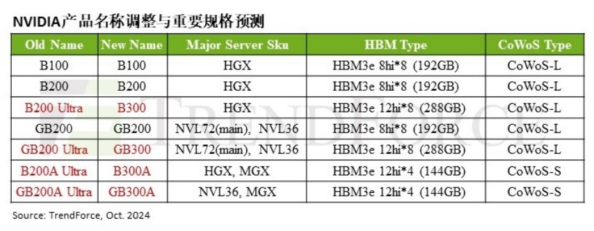 智通财经APP获悉,根据TrendForce集邦咨询最新调查,英伟达(NVDA.US)近期将其所有Blackwell Ultra产品更名为B300系列,预估明年将策略性主推B300和GB300等采用CoWoS-L的GPU产品,这将提升对先进封装技术的需求量。英伟达将原B200 Ultra更名为B300、GB200 Ultra更名为GB300,B200A Ultra和GB200A Ultra则分别调整为B300A和GB300A。B300系列产品按原规划将于2025年第二季至第三季间开始出货。至于B200和GB200,预计将在2024年第四季和2025年第一季之间陆续启动出货。