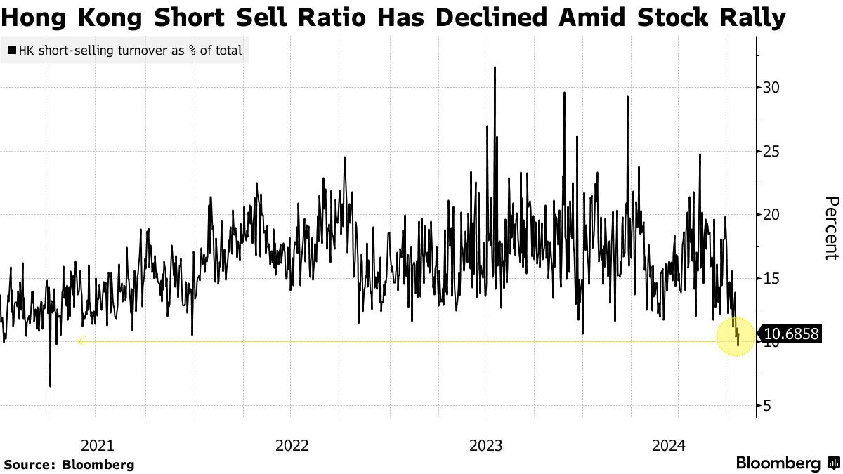 智通财经APP获悉,在中国当局推出一系列刺激措施推动香港股市上涨之后,港股的卖空活跃度处于三年半来最低迷的水平。根据媒体基于交易所数据计算,上周五港股卖空成交量占市场总成交量的比例下降至9.7%,这是自2021年4月以来的最低水平。不过,这一比例在周一小幅回升至10.7%。