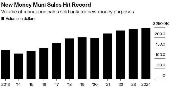 美国大部分基础设施都是通过4万亿美元的美国市政债券市场融资的,在这个市场上,各州和各城市为公共交通系统、高速公路、学校和其他大量项目筹集资金。随着美联储连续两年加息后利率企稳,美国市政债券的发售在2024年激增。随着疫情时期的刺激援助告罄,可用现金减少,各地政府也在为项目借入更多资金。