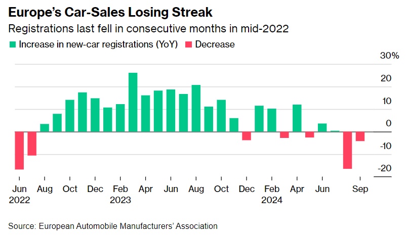 智通财经APP获悉,在9月份,欧洲汽车销量罕见出现连续两个月下降,这是两年多来的首次出现连续两个月下降,分析人士认为主要原因在于该地区经济增长因长期持续的通胀以及高利率重压而几乎处于停滞状态,消费者们纷纷削减支出。