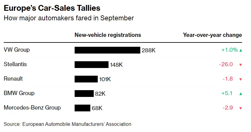 由于经济长期低迷以及欧洲央行长期维系高利率抗击通胀,导致消费者支出不断减少,欧洲汽车制造商一直在努力提高其欧洲市场的汽车销量。拥有菲亚特以及标致等品牌的欧洲汽车巨头Stellantis NV(STLA.US)销量同比下降幅度最大,Stellantis 在该地区的9月新车注册量骤降26%。