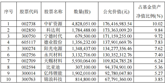 持仓方面,截至三季度末,重仓主要集中在电力设备、有色金属、新能车等板块,更明显的变化在于重仓股的调整,该基金在三季度更换了4只前十大重仓股,其中德业股份(605117.SH)、阳光电源(300274.SZ)、比亚迪(002594.SZ)、锦浪科技(300763.SZ)新进前十大,退出前十大的是璞泰来(603659.SH)、天齐锂业(002466.SZ)、多氟多(002407.SZ)和赣锋锂业(002460.SZ)。