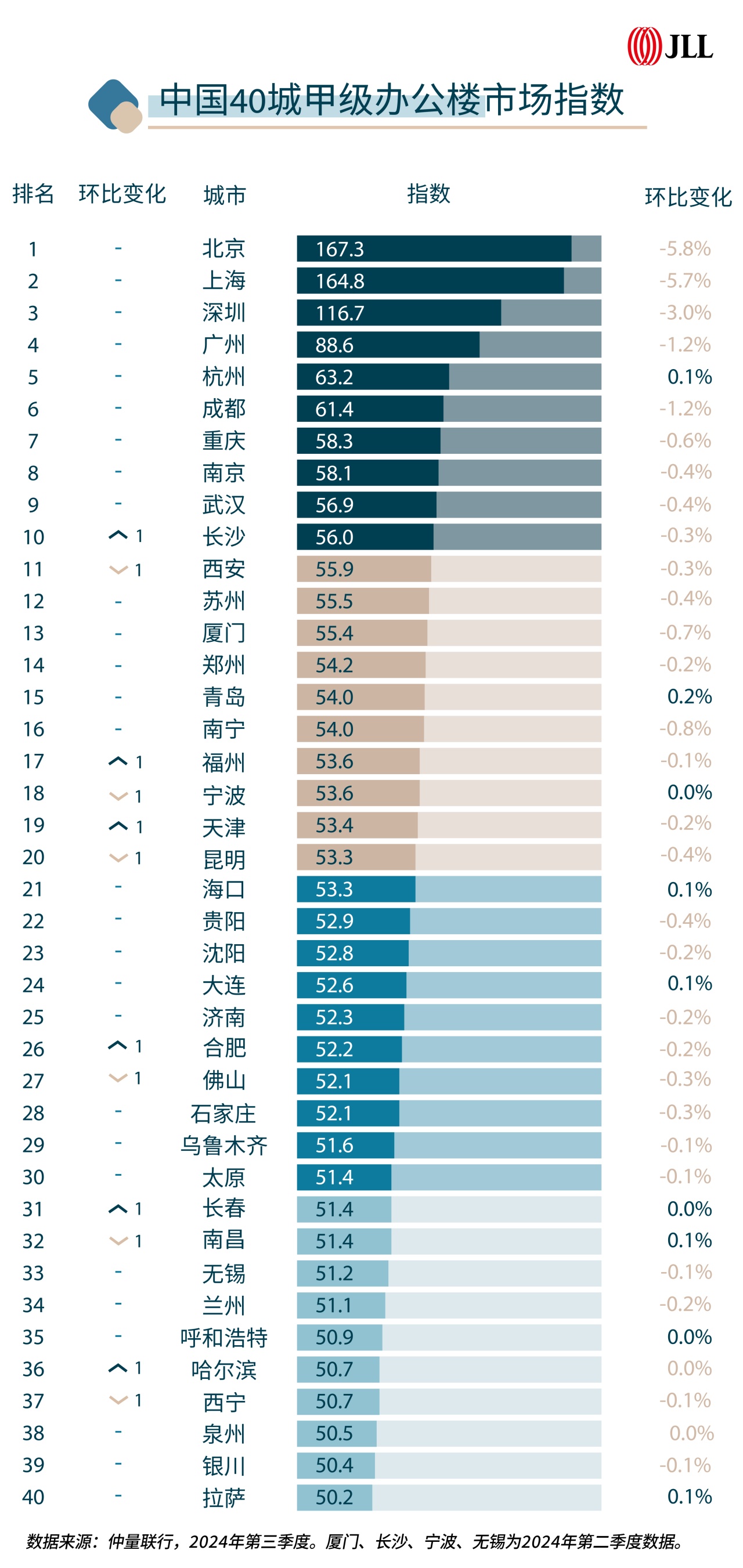 排名21-40的城市中,东北省会城市排名普遍提升。三季度,随着部分城市租金表现触底,该区间市场指数波动幅度有所收窄。部分城市止跌企稳,哈尔滨和长春老工业基地受政策支持,重塑竞争优势,吸引新质生产力企业入驻,指数排名有所上升。此外,海口在免税政策推动下持续吸引贸易类企业的新设需求,空置率有效降低,指数连续三个季度环比攀升。
