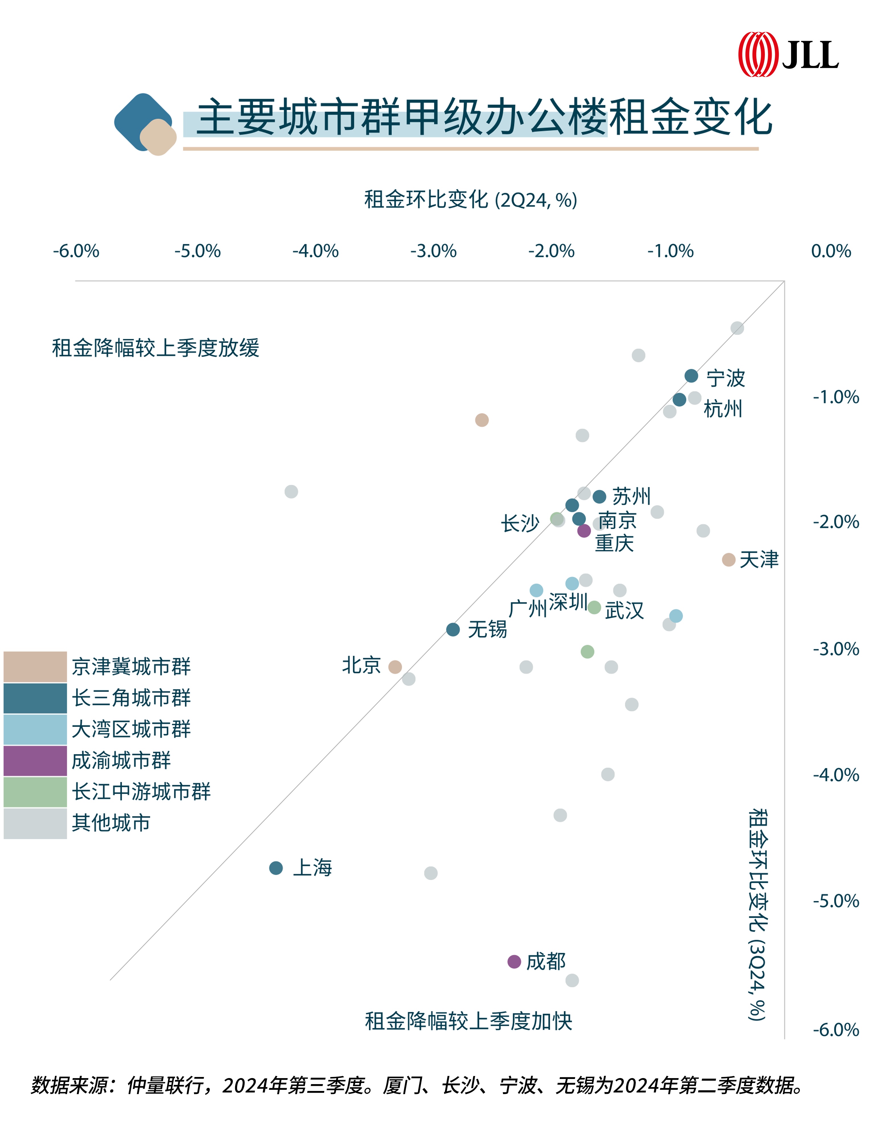 在全国40个主要城市中,仅5个城市的甲级办公楼租金降幅较上季度放缓,其中京津冀地区的北京和石家庄租金跌幅均有所收窄。除此之外,其他城市群的租金普遍跌幅扩大,三季度成为定调全年市场景气度的决胜局,业主均希望通过有效的刺激手段和折扣力度以促成交易,全国整体市场呈现加速筑底趋势。