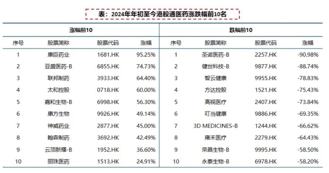 从二级市场表现来看,今年年初至今港股通医药涨幅榜前十家几乎都是已实现产品规模商业化且有核心产品进入医保目录的创新药企,涨跌幅分水岭已趋于明显。