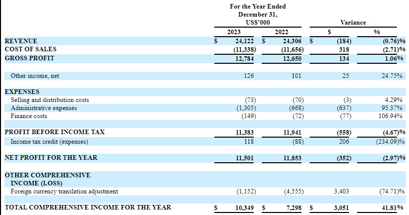 作为白茶茶叶产品的供应商,闽东红集团趁着行业增长东风成长。不过,近两年,公司的业绩初显颓势。2022年至2023年,公司的收入分别为2430万元(单位:美元,下同)及2410万元,同比微降0.8%;同期的净利润分别为1150.1万元及1185.3万元,同比下降2.97%。