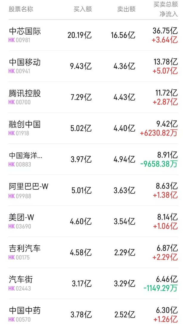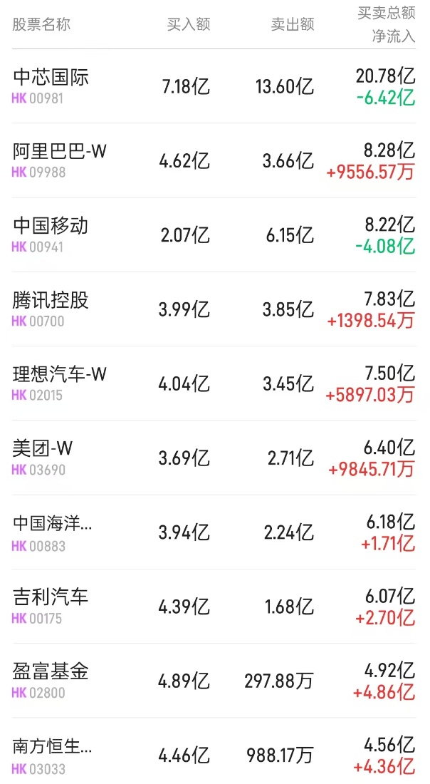 此外,阿里巴巴-W(09988)、中国移动(00941)分别获净买入2.33亿、9881万港元。而中芯国际(00981)遭净卖出2.77亿港元。