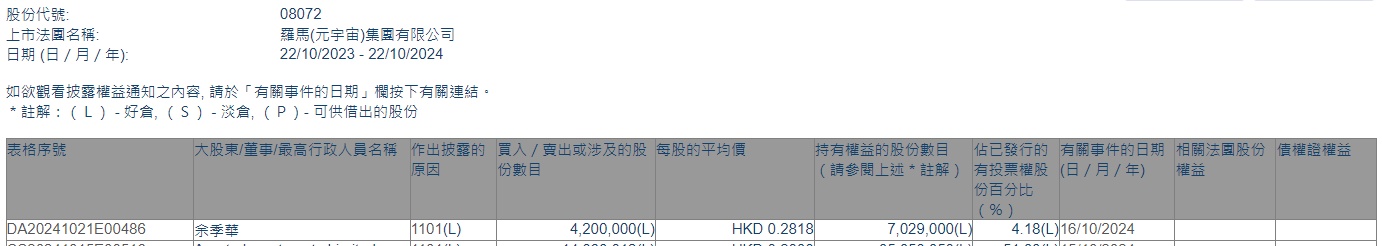 智通财经APP获悉,香港联交所最新资料显示,10月16日,余季华增持罗马元宇宙集团(08072)420万股,每股作价0.2818港元,总金额约118.36万港元。增持后最新持股数目702.9万股,最新持股比例为4.18%。