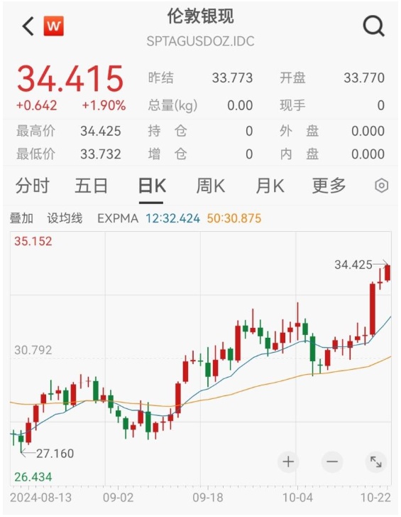 今年以来,国际银价迎来了大幅上涨“银牛”行情。国际现货白银上周五(10月18日)一举突破了33美元/盎司关口,创下了近12年来的新高。截至10月22日发稿,现货白银当天上涨1.90%,报34.41美元/盎司刷新了新高,日线走出了“六连阳”行情。