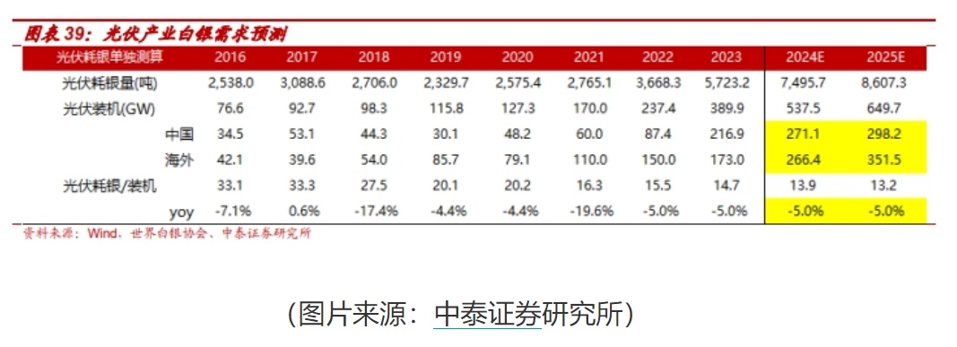 值得注意的是需求方面,华泰证券研报显示,光伏用银的持续增加将导致白银供需关系持续趋紧。白银作为导电性能最好的金属,在光伏产业的应用上具有不可替代的作用,主要是电池片的正银和背银,2011-2019年全球光伏用银复合增速15%,2023年光伏应用中的白银需求量达到6018.5吨,占白银总需求的16.19%,光伏耗银的持续增长持续拉大白银供需缺口。
