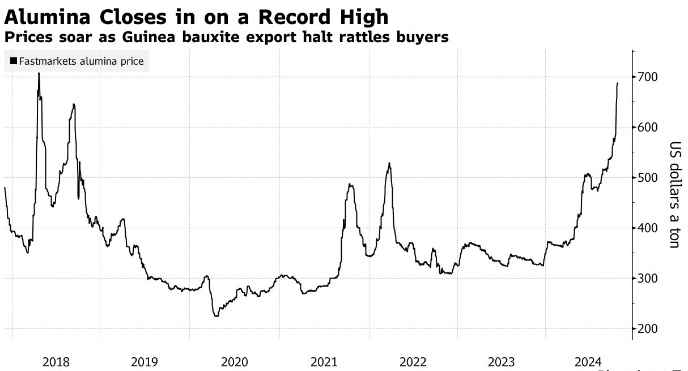 智通财经获悉,由于买家争相确保供应,铝的关键原材料价格正逼近纪录高位。此前,最大矿商国几内亚的出口中断担忧蔓延到中国。定价机构Fastmarkets Ltd.的数据显示,氧化铝价格本月迄今已飙升逾20%,目前距离2018年创下的707.75美元的纪录仅一步之遥。
