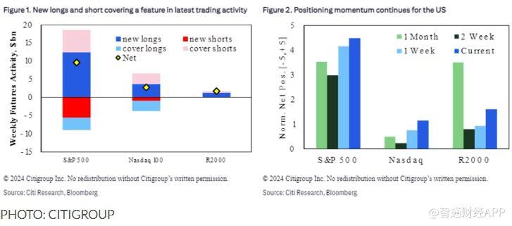 与标普500期货相比,纳斯达克100指数期货的持仓情况要温和得多,远未达到2023年7月和2024年7月时的泡沫状态。花旗团队表示,标普500期货中的空头回补活动可能是近期推高市场的原因之一。该团队还在报告中通过图表详细分析了期货市场的最新流动情况。