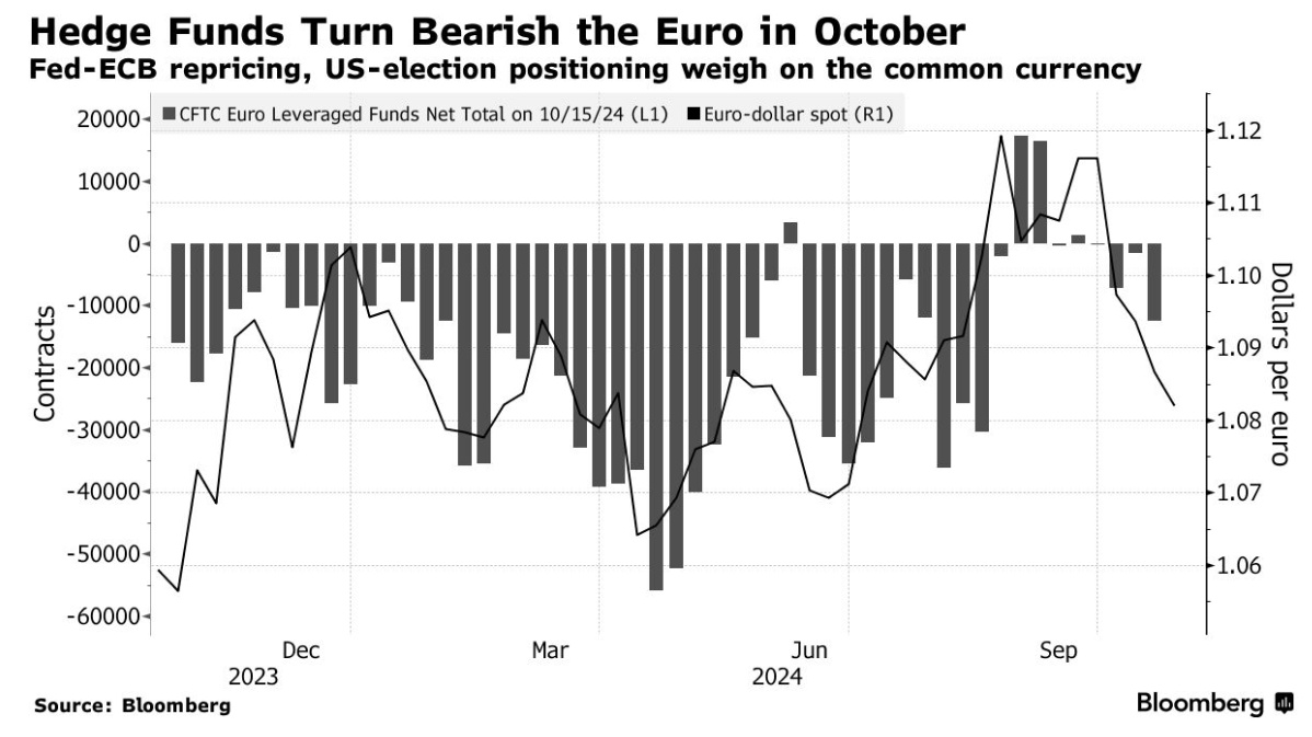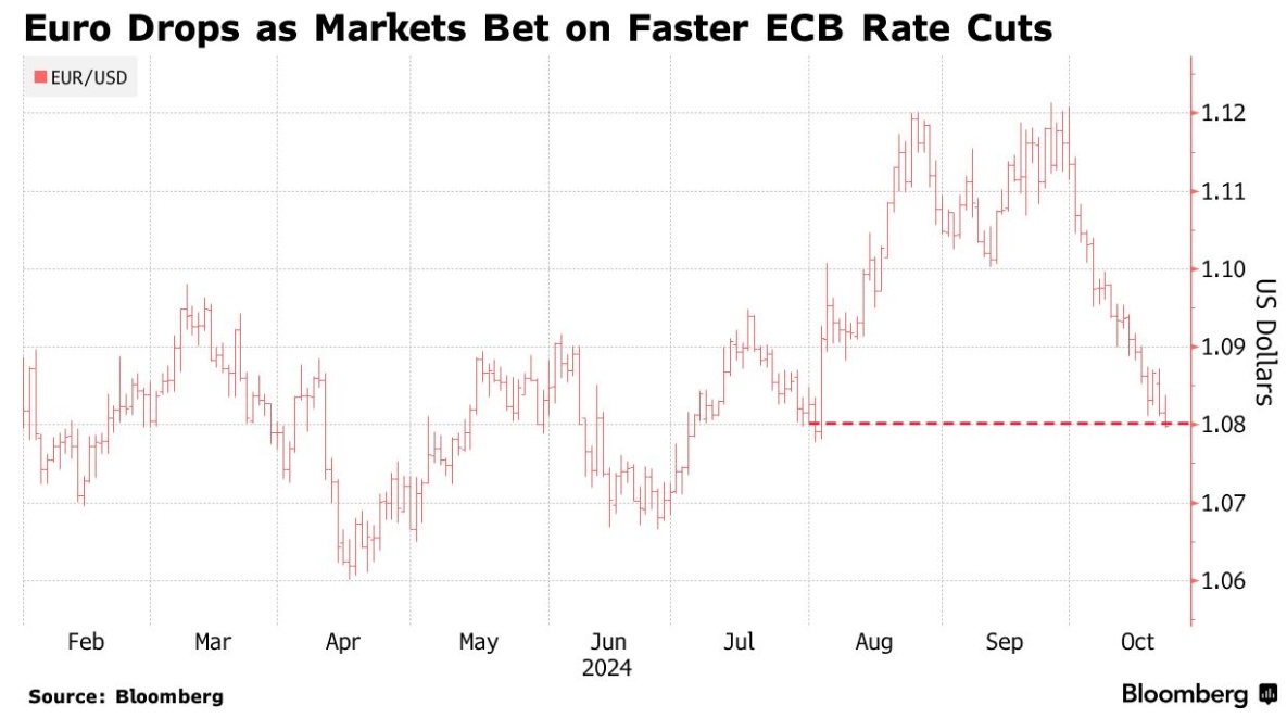 由于美国经济逐渐脱离欧洲,且特朗普可能胜选后部分投资者已为上调关税做好准备,欧元10月份迄今已下跌2.7%。