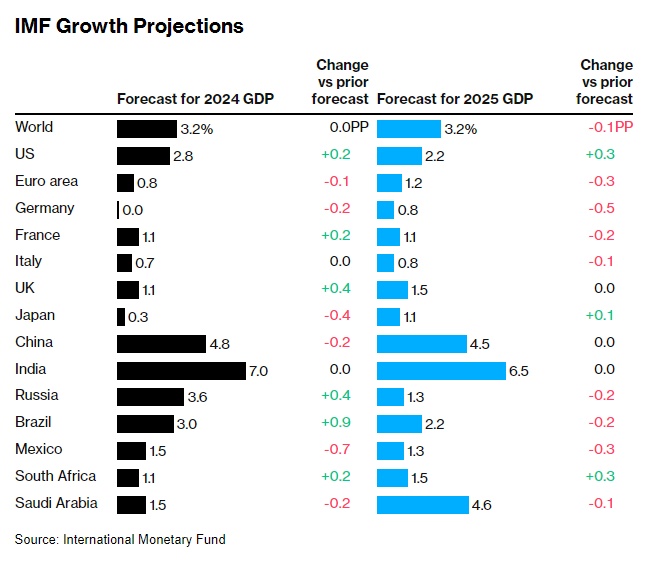 IMF在周二发布的《世界经济展望》更新中表示,明年全球产出将增长3.2%,比7月的预测低0.1个百分点。今年的预测维持在3.2%不变。明年的通胀率将从2024年的5.8%降至4.3%。