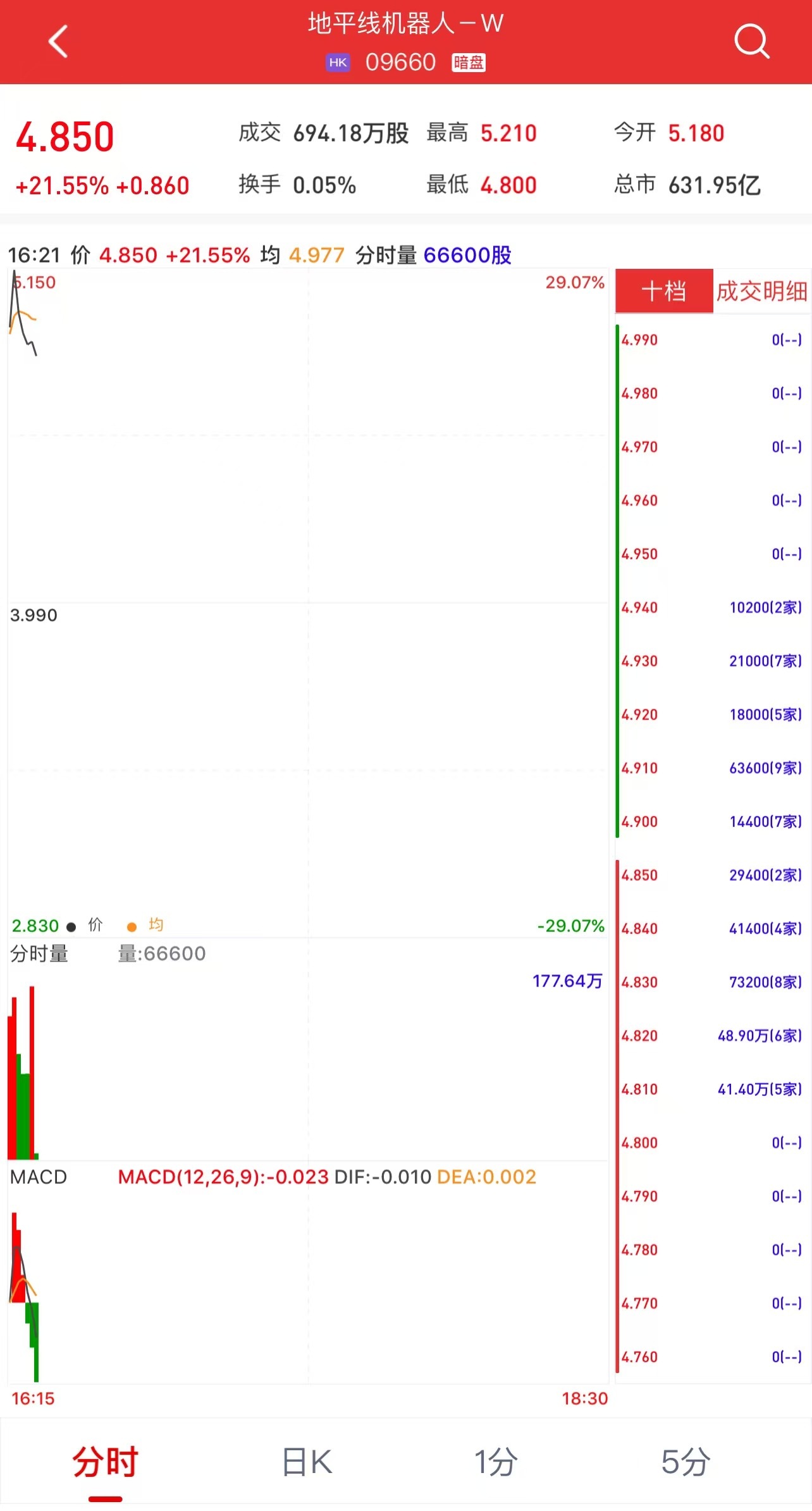 智通财经APP获悉,地平线(09660)将于10月24日(周四)在香港挂牌。截至发稿,利弗莫尔证券暗盘交易显示报价4.85港元,较招股价3.99港元上涨21.55%;每手600股,不计手续费,每手赚516港元。