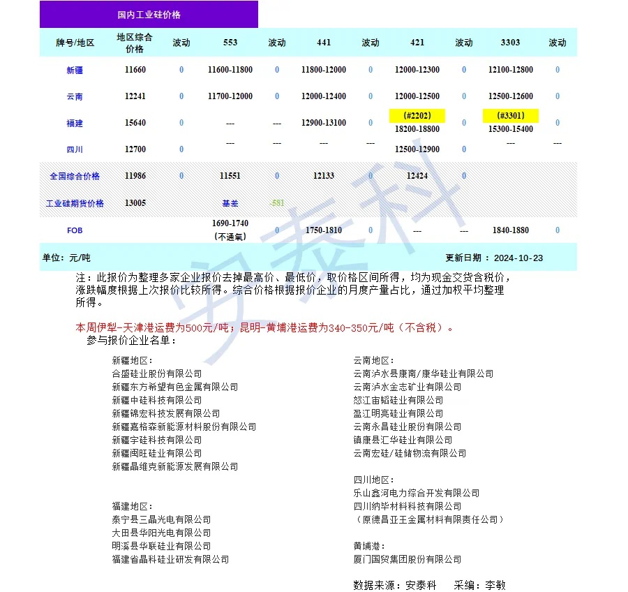 智通财经APP获悉,10月23日,硅业分会发文称,本周工业硅现货价格整体持稳。过去一周(2024年10月17日-23日),17日主力合约换月至2412,收盘价从12680元/吨震荡波动至13005元/吨,涨幅为2.56%。全国综合价格和各牌号综合价格持稳,FOB价格持稳。