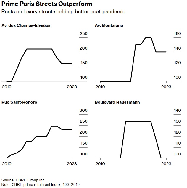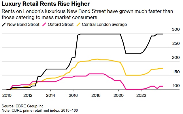 世邦魏理仕的数据显示,与那些专注于大众市场消费者的品牌相比,奢侈品牌对在最好的购物街上获得最受追捧的空间的关注,使租金上涨得更快、更持久。该公司的数据显示,伦敦新邦德街(New Bond Street)的租金几乎是2010年的三倍,与主要街道的竞争对手牛津街(Oxford Street)形成鲜明对比,牛津街的租金几乎没有增长。巴黎的情况也是如此,高档的圣奥诺雷街(Rue Saint-Honore)远远超过了奥斯曼大道(Boulevard Haussmann)。