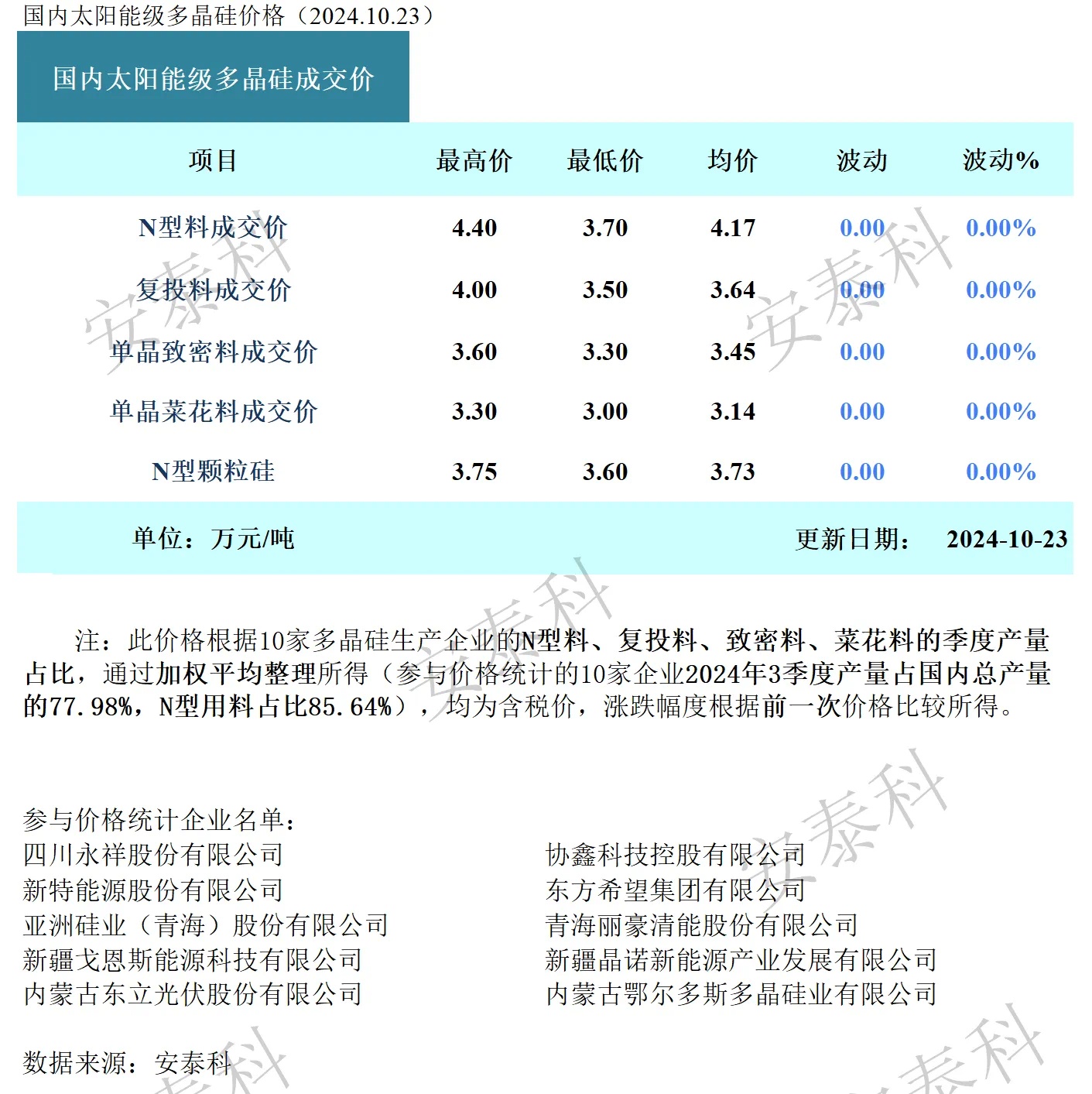 智通财经APP获悉,10月23日,硅业分会发文称,本周多晶硅价格持平。n型棒状硅成交价格区间维持至至3.70-4.40万元/吨,成交均价为4.17万元/吨;P型单晶致密料成交价格区间维持在3.30-3.60万元/吨,成交均价为3.45万元/吨;N型颗粒硅成交价格区间维持至3.60-3.75万元/吨,成交均价为3.73万元/吨。