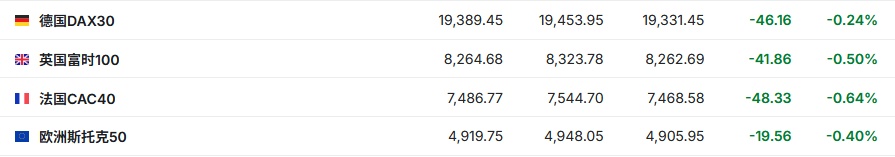 2. 截至发稿,德国DAX指数跌0.24%,英国富时100指数跌0.50%,法国CAC40指数跌0.64%,欧洲斯托克50指数跌0.40%。