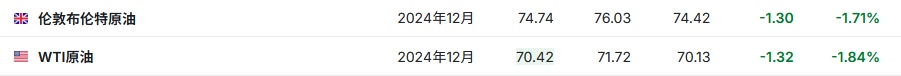 3. 截至发稿,WTI原油跌1.84%,报70.42美元/桶。布伦特原油跌1.71%,报74.74美元/桶。
