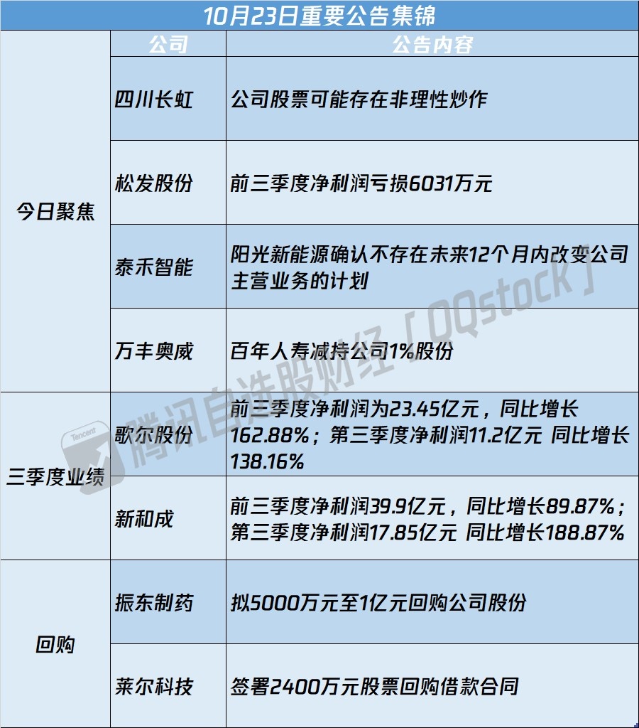1、歌尔股份:前三季度净利润为23.45亿元,同比增长162.88%;第三季度净利润11.2亿元 同比增长138.16%