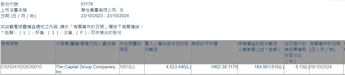 智通财经APP获悉,香港联交所最新资料显示,10月18日,美国资本集团增持华住集团-S(01179)452.3440万股,每股作价38.1170港元,总金额约为1.72亿港元。增持后最新持股数目约为1.65亿股,最新持股比例为5.13%。