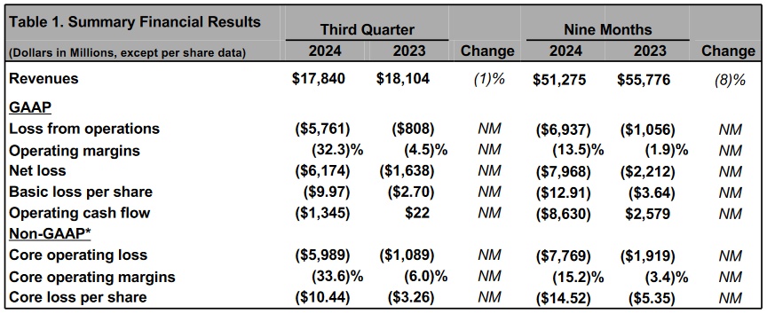净亏损为61.74亿美元,上年同期净亏损为16.38亿美元。在NON-GAAP会计准则下,核心经营亏损为59.89亿美元,上年同期为亏损10.89亿美元;核心每股亏损为10.44美元,上年同期为亏损3.26美元。经营现金流为-13.45亿美元,自由现金流为-19.56亿美元。