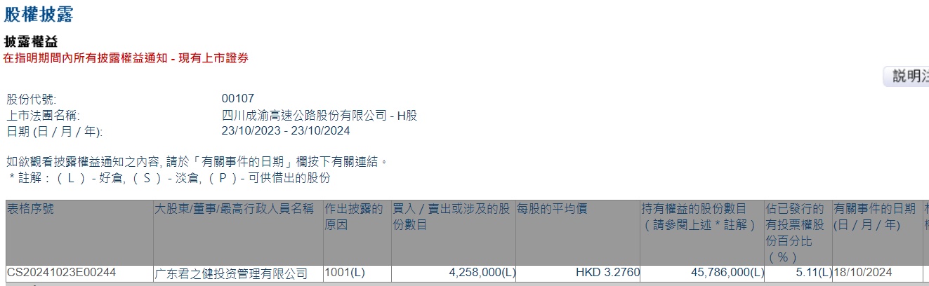 智通财经APP获悉,香港联交所最新资料显示,10月18日,广东君之健投资管理有限公司增持四川成渝高速公路(00107)425.8万股,每股作价3.276港元,总金额约为1394.92万港元。增持后最新持股数目为4578.6万股,最新持股比例为5.11%。