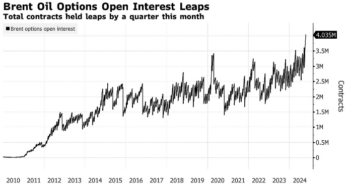 智通财经获悉,石油交易商正持有创纪录数量的期权合约,以防范中东可能出现的供应中断导致油价飙升的风险。本周布伦特原油期权未平仓合约首次突破400万份合约,相当于40亿桶原油。本月到目前为止,交易员持有的头寸总数已经增加了25%以上。