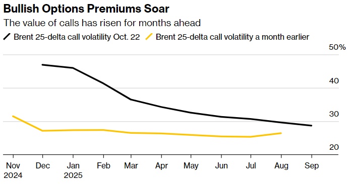 防范油价飙升的措施还体现在石油市场定价期权合约的方式上。近月布伦特看涨期权相对看跌期权的溢价为2022年3月(俄乌战争爆发后不久)以来最大。期权合约也押注未来几个月溢价延续,表明交易员目前预计供应将面临长期威胁。