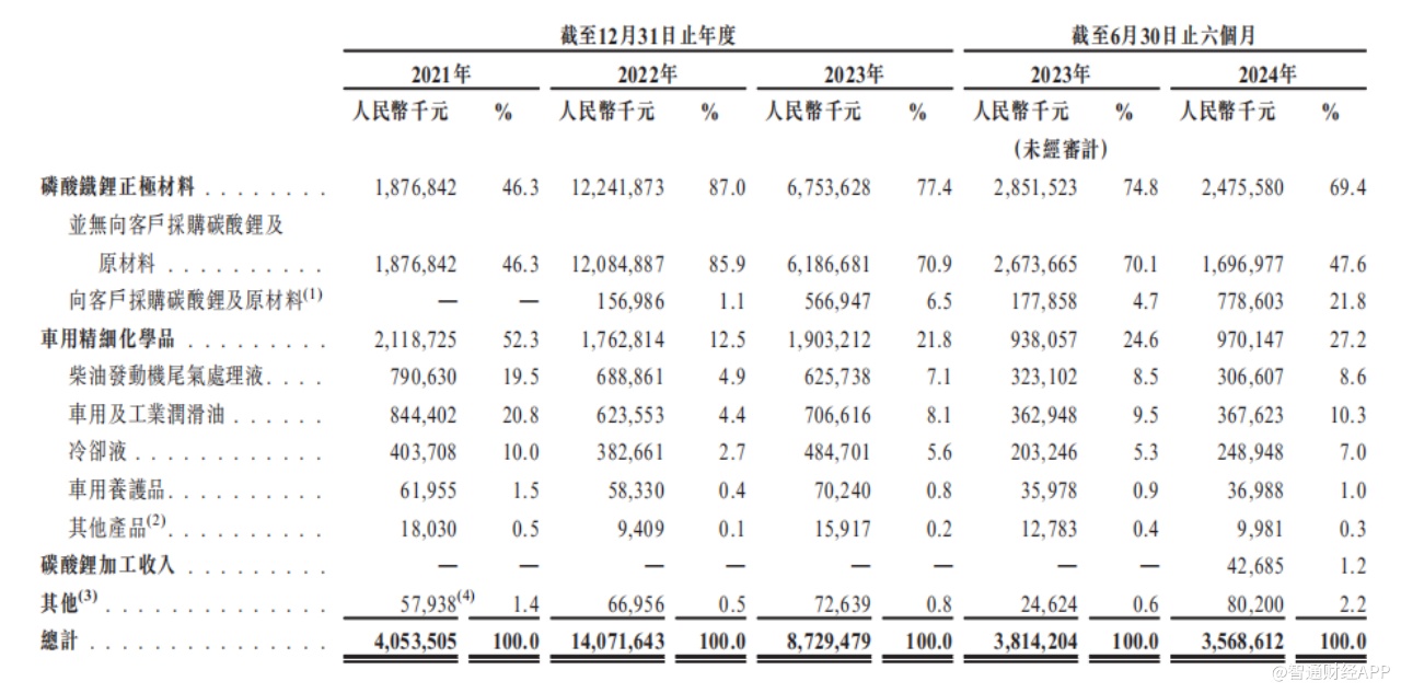 目前,磷酸铁锂正极材料业务已成为龙蟠科技第一大业务。2024年上半年,该业务实现收入24.75亿元,占比69.4%;此外,车用精细化学品业务在上半年实现收入9.7亿元,占比27.2%。