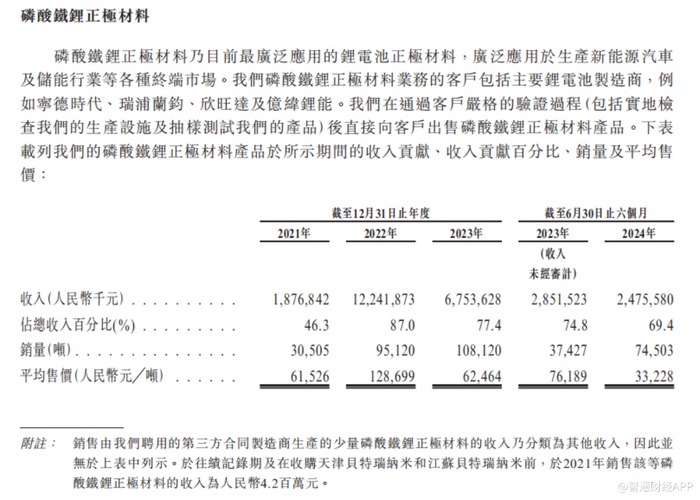 招股书显示,2022年,公司磷酸铁锂正极材料的平均售价为12.87万元/吨,2023年下降至6.25万元/吨,2024年上半年进一步下降至3.32万元/吨。