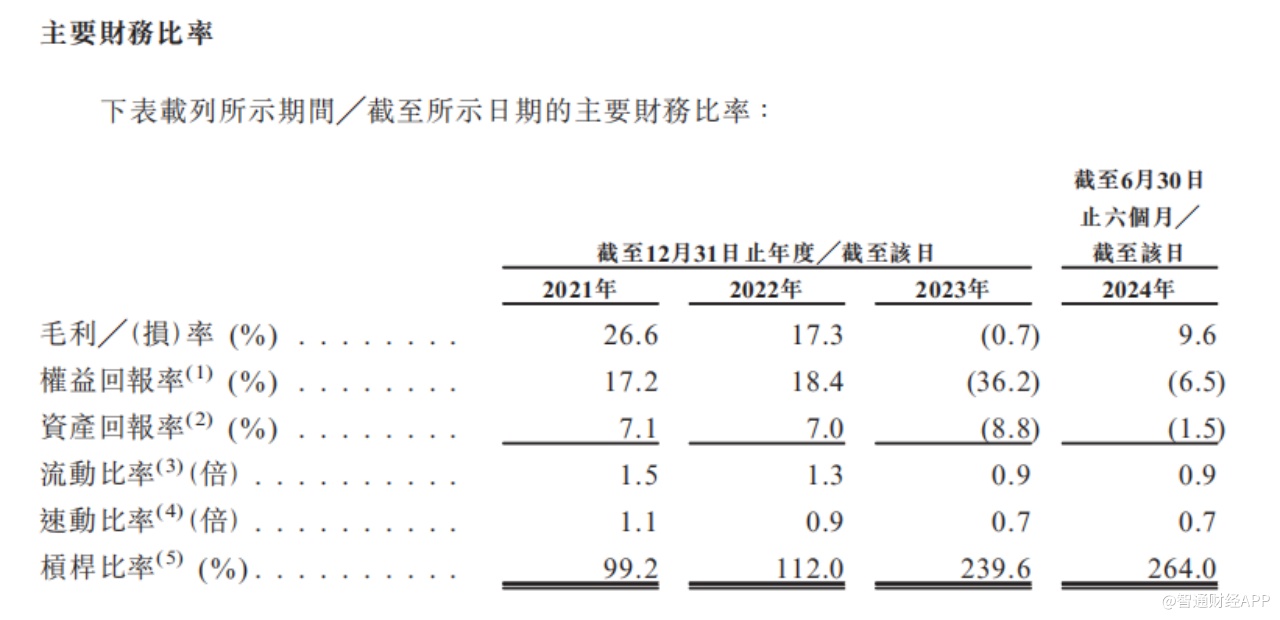 截至2021年、2022年及2023年12月31日以及2024年6月30日,公司的固定利率银行借款分别约为17.64亿元、37.69亿元、79.05亿元及78.09亿元。截至同日,公司的资产负债比率分别为99.2%、112%、239.6%及264%。